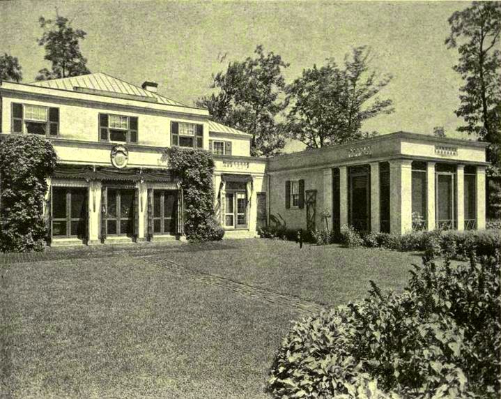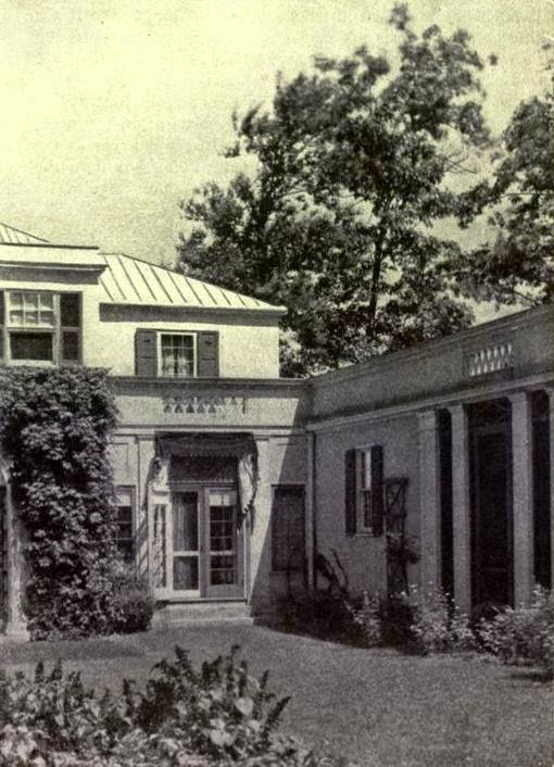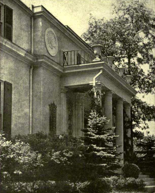 The Davies house at Roslyn, Long Island, is not a period house, though it looks like an 18th century colonial. It is personal and polychrome. It is a cream-colored stucco house with Greek columns and Venetian grilles. The roof is peacock blue, and there are cerulean blues on the window frames, black caps on the chimneys, big terra cotta panels over either side of the vestibule, and brilliant terra cotta colors against the buff-colored stucco. Yet it all looks quiet, for everything is in almost the same key and scale. It stands on top of a wooded hill, with an open court to the south surrounded on three sides by the middle part of three stories and the two wings of one story each. The middle part contains on the ground floor the dining room, library, drawing room, and loggia looking out on the court. The southwest wing has two guest rooms and a porch open to all the breezes. The southeast or service wing goes over the hill and has two stories at the back, with a garage below, which gives it an appearance of fitting and clinging to the hill.