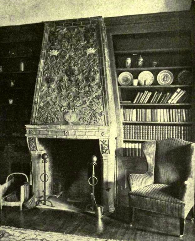 The colorful lion head swags with bunches of fruits and leaves that flank the house's main entrance were made by the Moravian Pottery and Tile Works in Doylestown, PA, in 1916. The Library fireplace was also made by the Moravian Pottery and Tile Works at the same time.